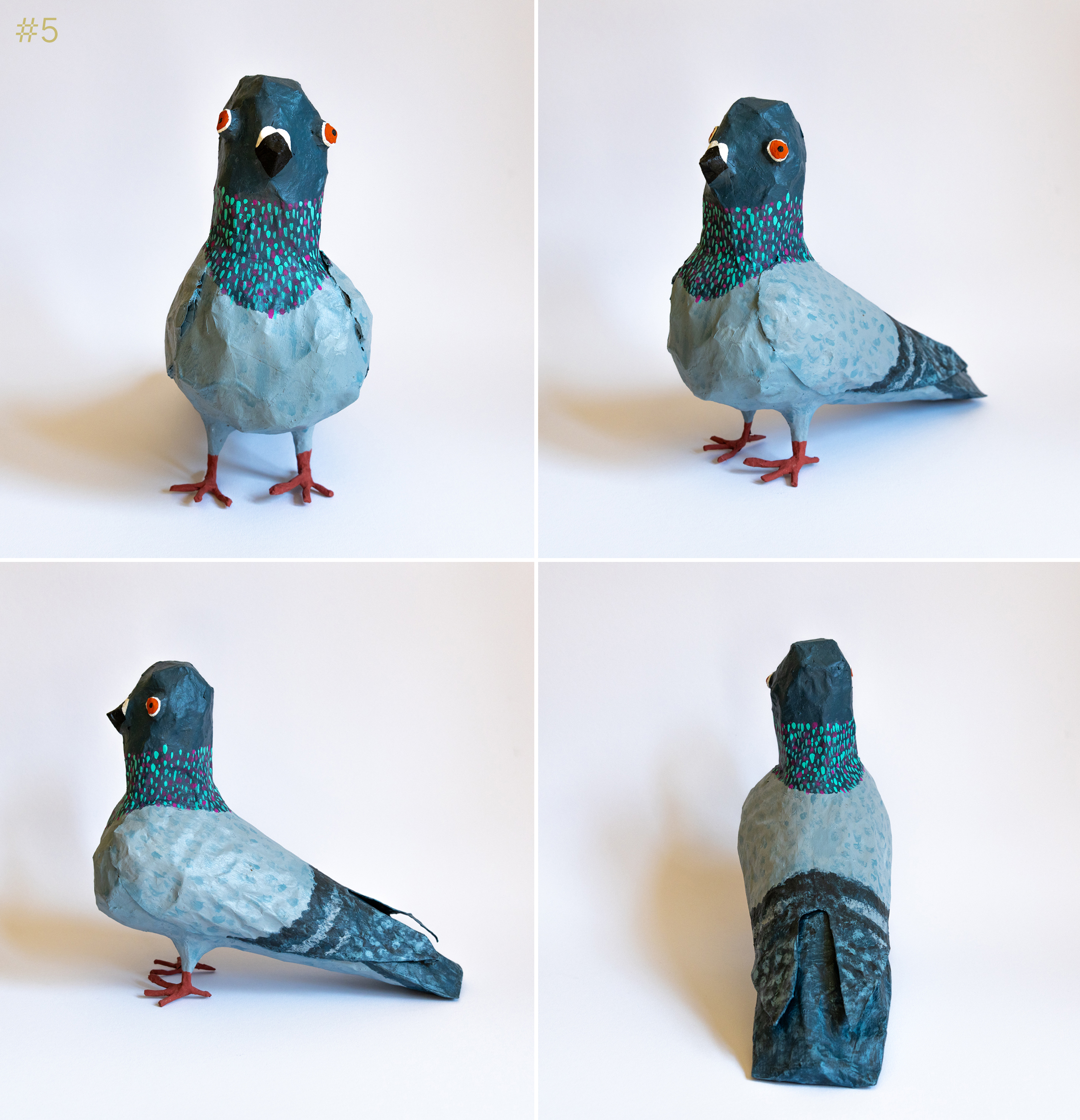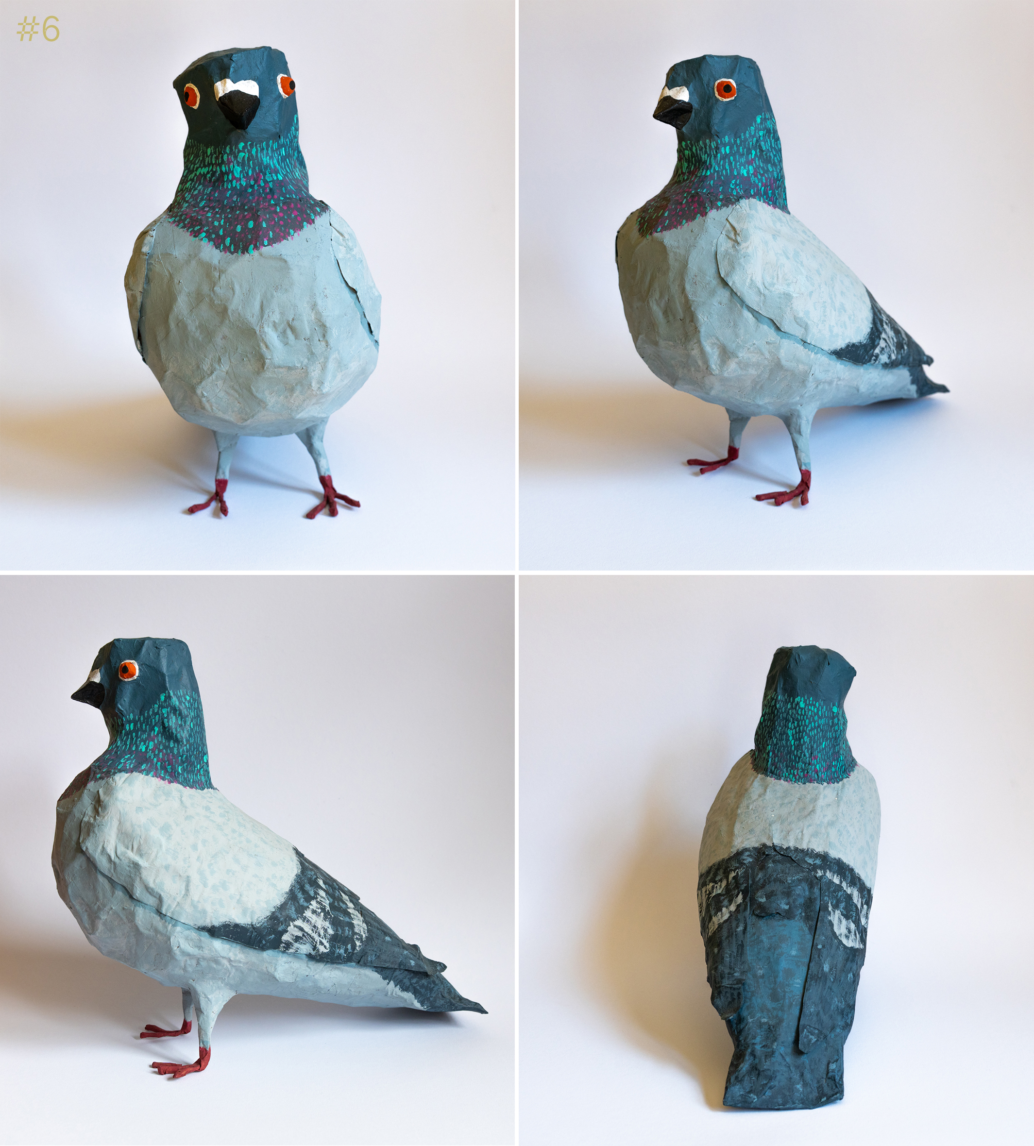 Each pigeon is life-size and has been handmade using a chicken wire frame, papier-maché exterior and hand painted to highlight their unqiue personalities.